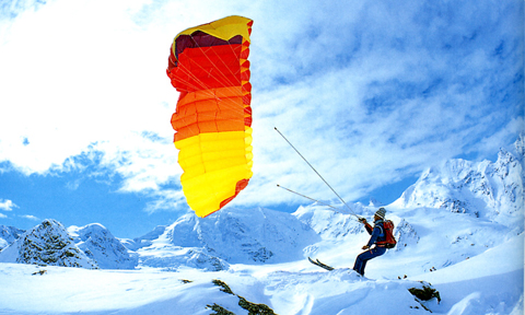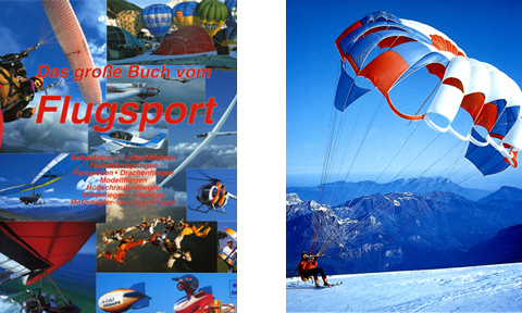 | Der Amerikaner Dan Poynter verfaßte 1972 und 1973 zwei grundlegende Handbuecher: "Hanggliding - the Basic Handbook of Skysurfing" sowie "The Parachute Manual", in denen sowohl Schlepp- wie Fußstarts am Hang mit Flaechenfallschirmen erwaehnt wurden. Parallel dazu gab es im deutschsprachigen Raum kaum eine Entwicklung, sieht man von zwei Ausnahmen ab: Dieter Strasilla und Fritz Dolezalek. Es ging um die Moeglichkeit, sich per Ski und einer Profilflaeche vom Wind am Hang hochziehen zu lassen. Strasilla nannte es "Ski-Sailing" und ahnte nicht, als er 1965 zunaechst mit Rundkappen begann, wohin sich das alles entwickeln sollte. Die ersten Hangsegelversuche fanden im Winter bei St. Moritz / Engadin im Malojawind statt, welcher ideale Voraussetzungen bot. | The American Dan Poynter published two fundamental hand-books in 1972 und 1973: "Hanggliding - the Basic Handbook of Skysurfing" as well as "The Parachute Manual", in which both starts with the rectangualr parapente, the traction - as well as the foot-starts were mentioned. There were hardly any developments in the German speaking countries with the exception of: Dieter Strasilla and Fritz Dolezalek. They dealt with the possibility, to have themselves being pulled uphill on skis by the means of wind acting on a chute. Strasilla called it "Ski-Sailing" und did not fathom at that time, when he started with round canopies in1965, where this would lead to. The first experiments in gliding along the slopes occurred in the winter near St. Moritz, Engadin, when the Maloya wind caused ideal conditions. | ||||||