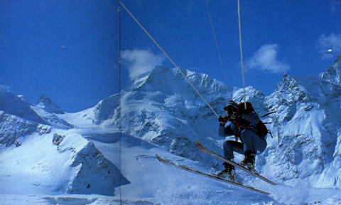 | Der Wind ist Partner, Kraft: Dr. Dieter Strasilla hat das schon mit einem Fallschirm probiert; sich, mit Ski an den Fuessen, bergauf schleppenzulassen, vom Wind. Mit diesem neuen, steuerbaren Tragflaechensegel, wie er es im Fruehjahr 1981 in der Diavolezza bei Pontresina vorfuehrte, kann er kreuzen wie ein Segler, kann sich schleppen lassen, auch emporheben, ueber Gletscherspalten etwa. Er braucht keinen Lift, keine Seilbahn - nur Wind... | The wind is partner and force: Dr. Dieter Strasilla experienced this when using a parachute when he let himself being towed uphill. With this new steerable wing, demonstrated in Spring 1981 at the Diavolezza at Pontresina, he can tack like a sailor, he can be towed, even lifted up over possible crevasses. He needs no ski-lift, no cable car - he only requires wind. | ||||||