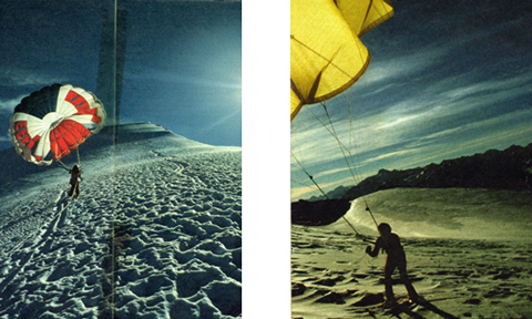 | Sowjetische Langlaeufer mit Schub- propeller, Strasilla mit Ziehfallschirm. | Soviet cross-country skiers driven by a propeller; Strasilla pulled by a round-canopy parapente. | |||