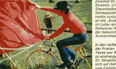 | "In Texas machte Strasilla erste Versuche mit Fallschirm und einem Velo“ (1960) | "In Texas Strasilla conducted the first experiments with a parachute and a bike" (1960) | |||