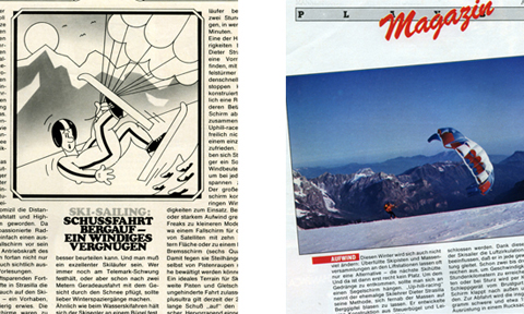 Dieter Strasilla intertwines his art of sailing uphill with the exhilaration of flying down. In 1980 he sails on the Aletsch Glacier on his skis up to the Jungfraujoch and then flies down to the Bernese Oberland. His next goal is France. He sails up the Vallee Blanche in the Mont Blanc area; on the top of the Aiguille du Midi, waiting for a shift of wind, he flies down to Chamonix the next day. This happened in 1981. Gone are the times for experimenting secretly, shying away from publicity: Famous magazines like the "Swiss Illustrated", "Bunte" or "Paris Match" describe the daring glide- and flight-artists. Dieter and Andrea attempt to commercialize their product. Andrea Kuhn becomes flight instructor in his windsurf school in Oberengadin. In 1981 Dieter Strasilla initiates the production of his parapente in Italy. However, there is a lack of interest at that time. It appears that the right moment has not yet arrived for this sport to be accepted by the public. In 1984 Hugo Stamm from the Swiss newspaper Tagesanzeiger asks the Swiss Aviation Bureau, whether this new aerial device is known. The inspector for non-motorized flight Fritz Bigler comes back with a negative response. However he suggests that this new flying sail should be placed under the auspices of the Swiss Hangglider Association and that the para-sail schools also should associate with this organization. | |||